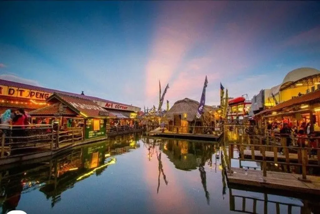Pasar Apung Batu jadi salah satu spot sunset unik di Malang. Terletak di kawasan Museum Angkut, tempat ini menawarkan suasana senja yang estetik dengan lampu-lampu yang memantul di permukaan air, cocok untuk foto-foto atau sekadar bersantai sambil menikmati kuliner tradisional. Waktu terbaik berkunjung adalah pukul 16.30–18.00 WIB saat matahari mulai tenggelam dan suasana makin romantis.